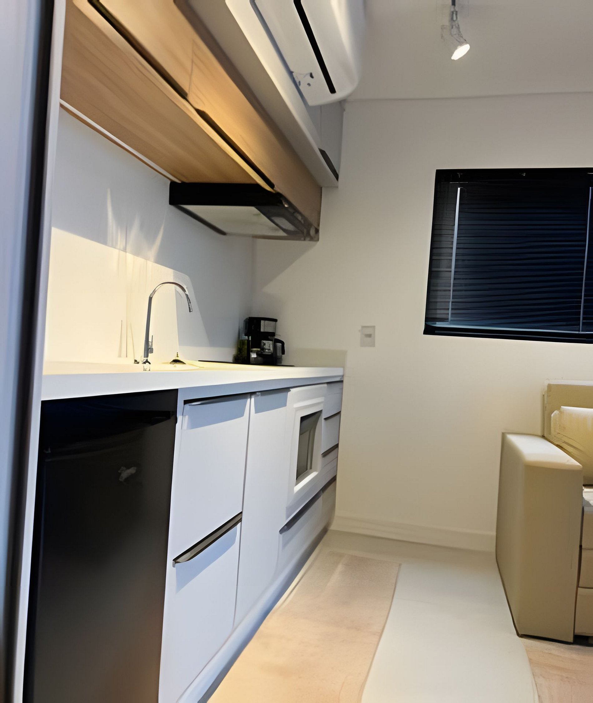 - A cozinha conta com chaleira elétrica, cafeteira, micro-ondas, frigobar 93L e louças.