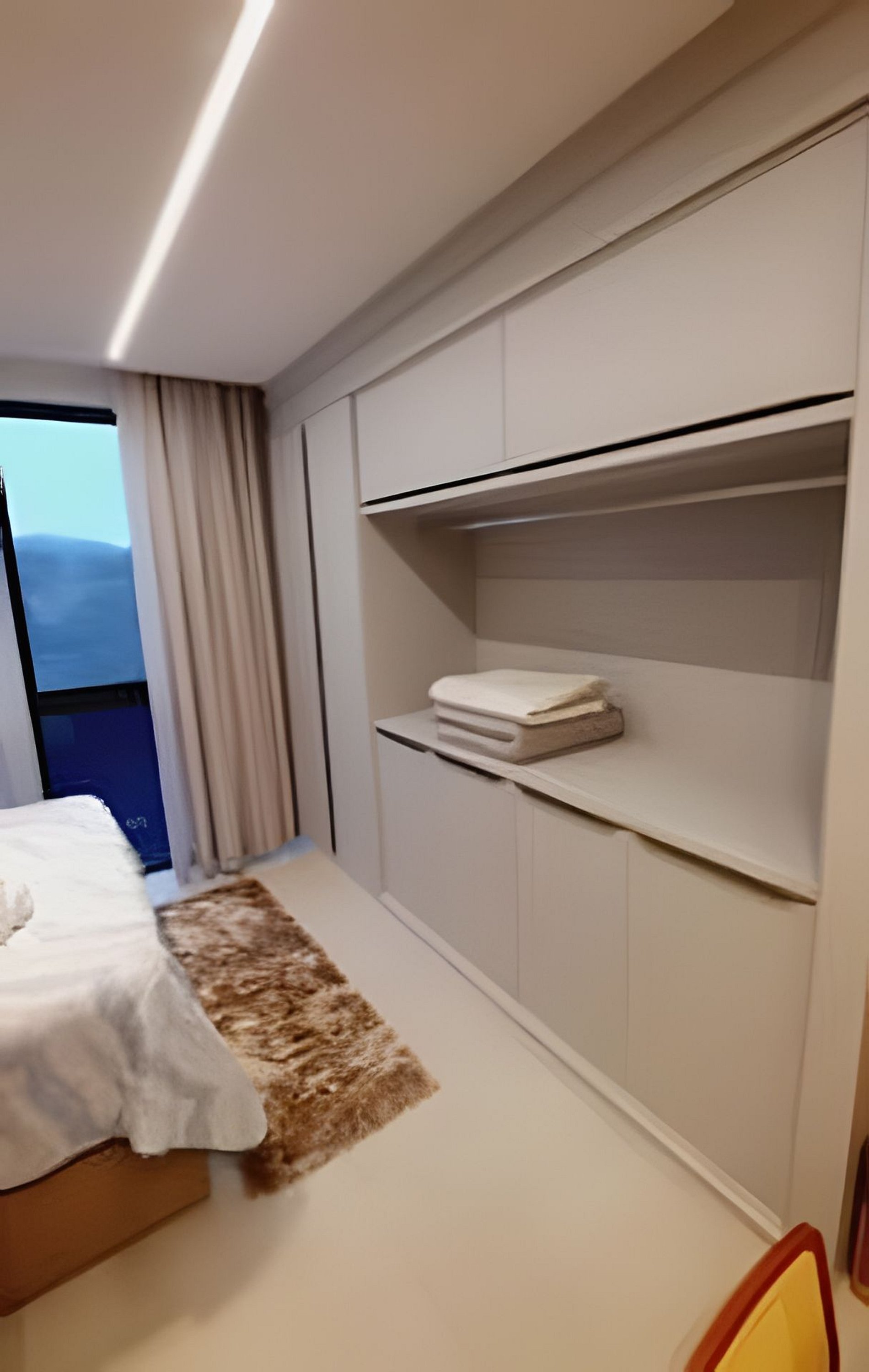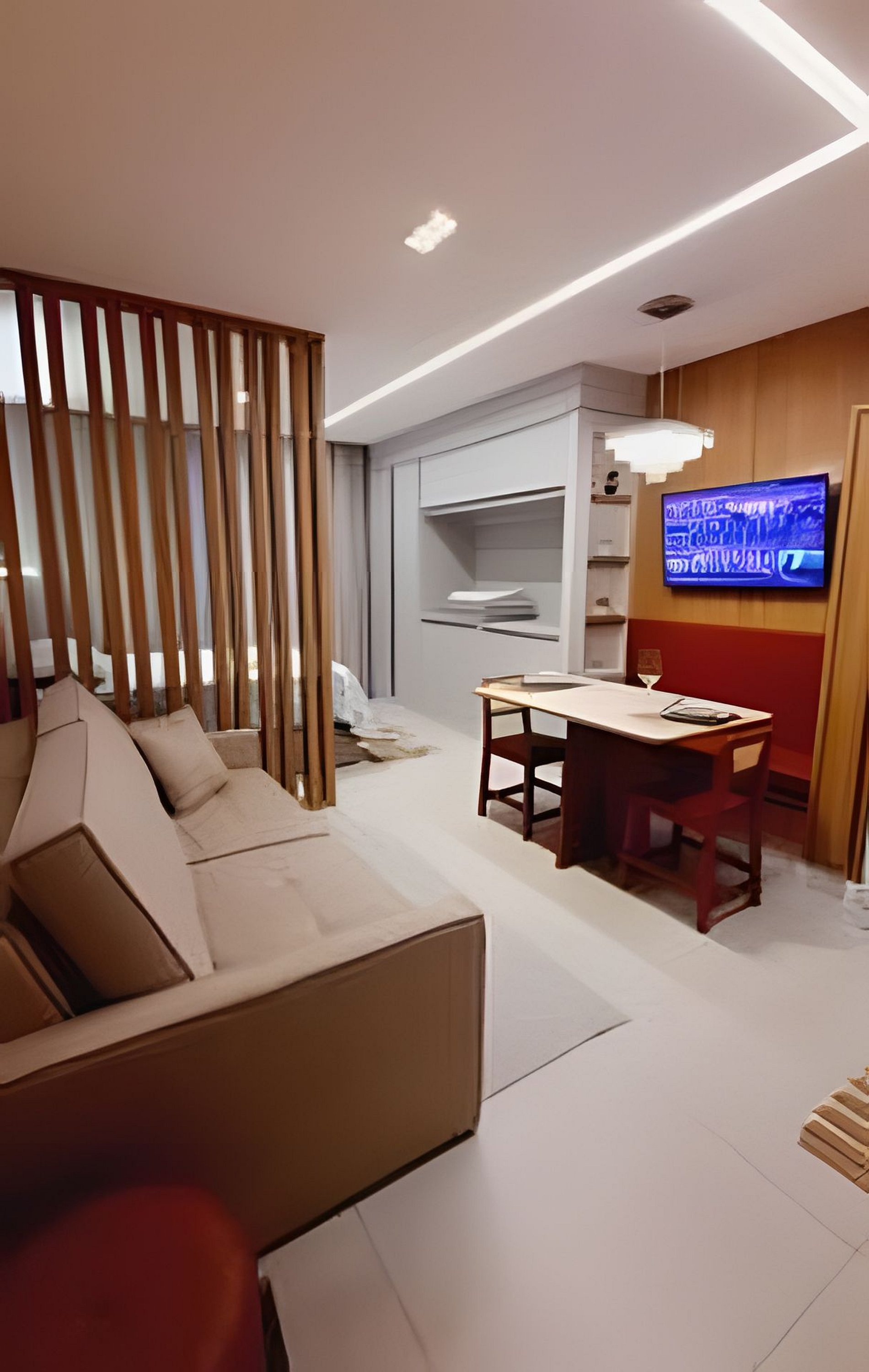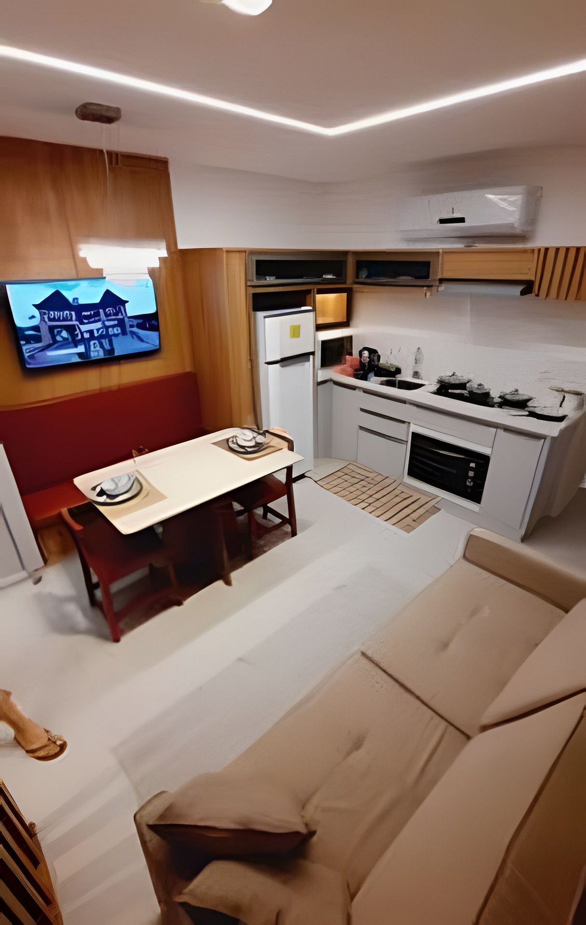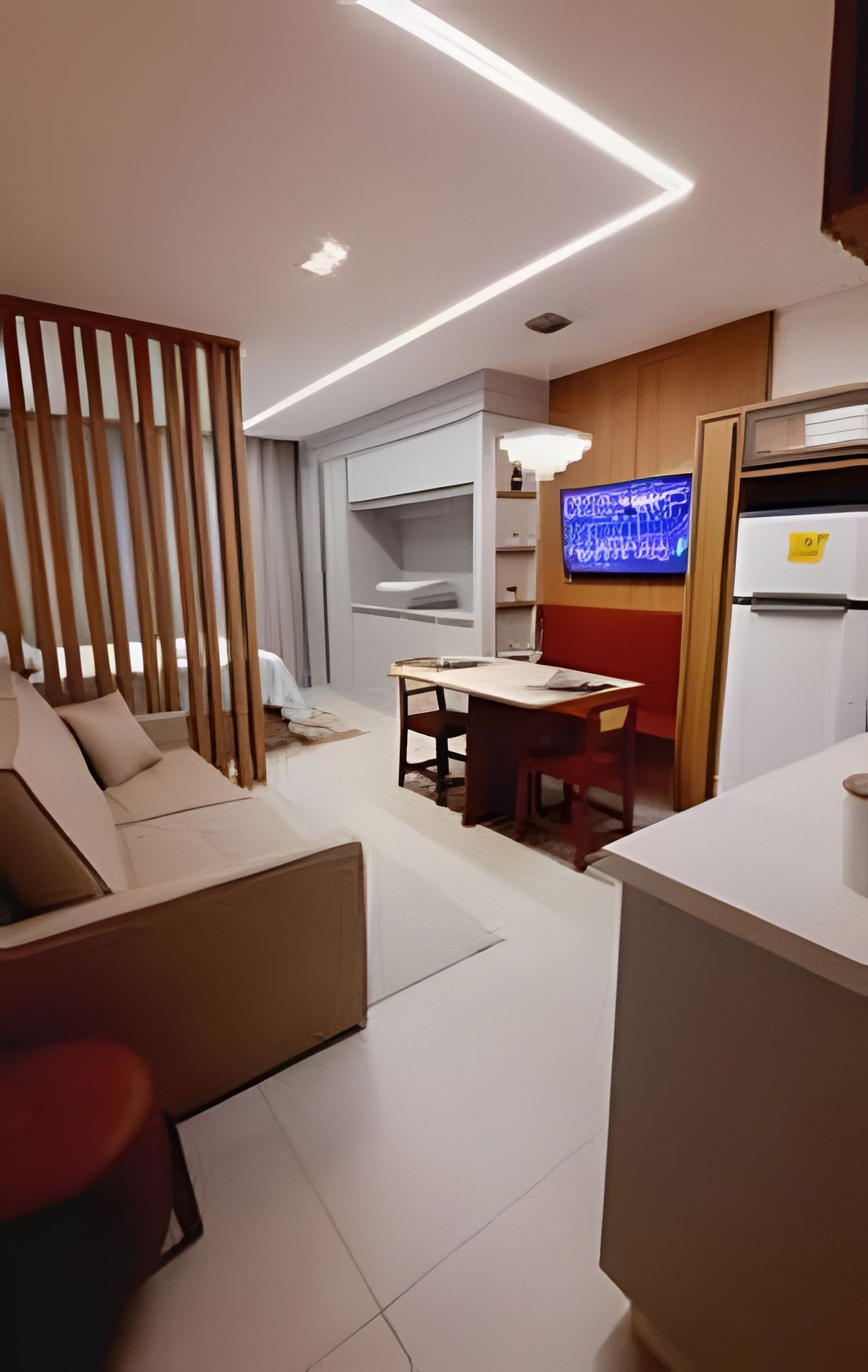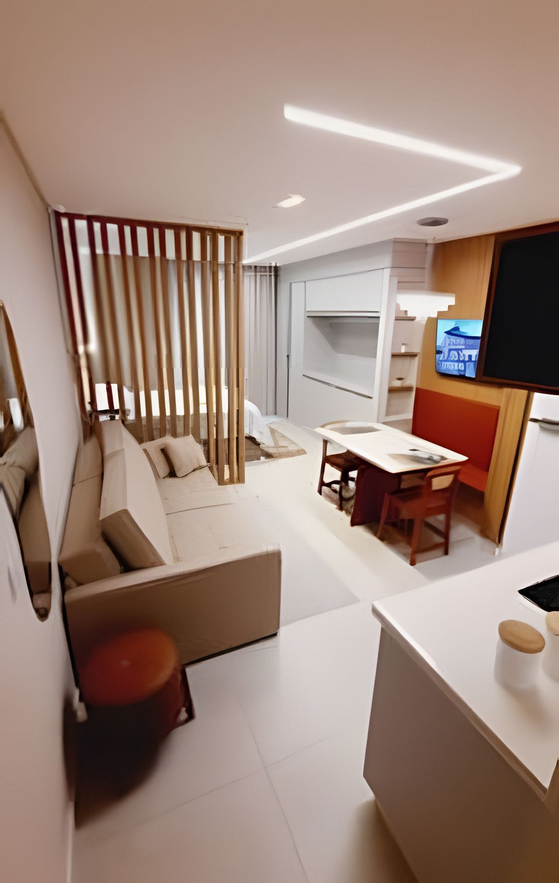 Sala de estar e entretenimento O espaço conta com sofá-cama confortável e ambiente acolhedor para descanso. A iluminação indireta no teto valoriza o design e cria um clima relaxante, perfeito para assistir TV ou aproveitar momentos tranquilos.