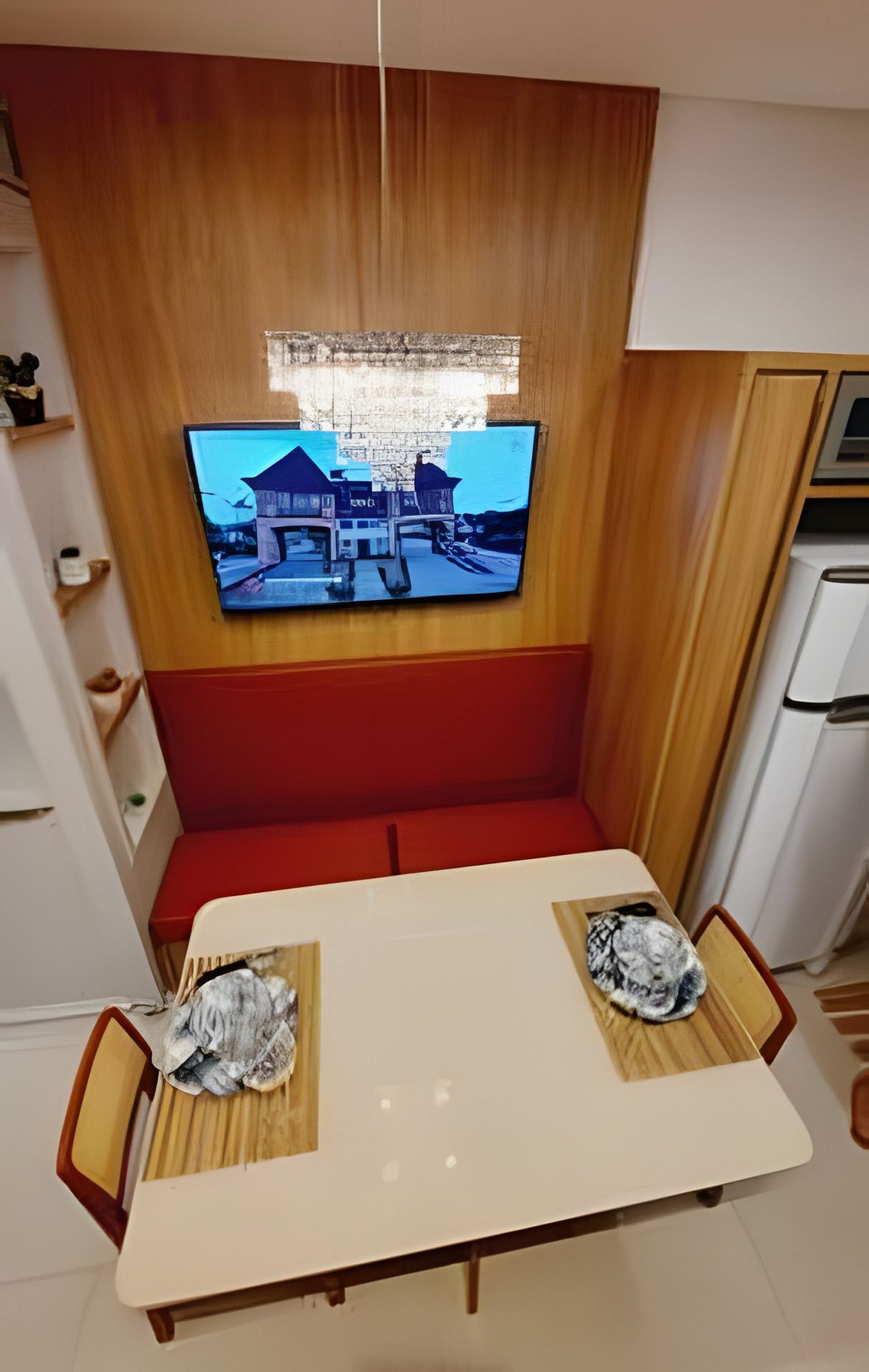 Cozinha funcional e elegante A cozinha é compacta, moderna e bem equipada para o preparo de refeições rápidas. Conta com bancada, utensílios essenciais e integração com a área de jantar, que acomoda duas pessoas de forma confortável. Área de refeições A mesa de jantar foi pensada para momentos a dois, seja para café da manhã ou um jantar especial. O ambiente é funcional, bem iluminado e integrado ao restante do loft.
