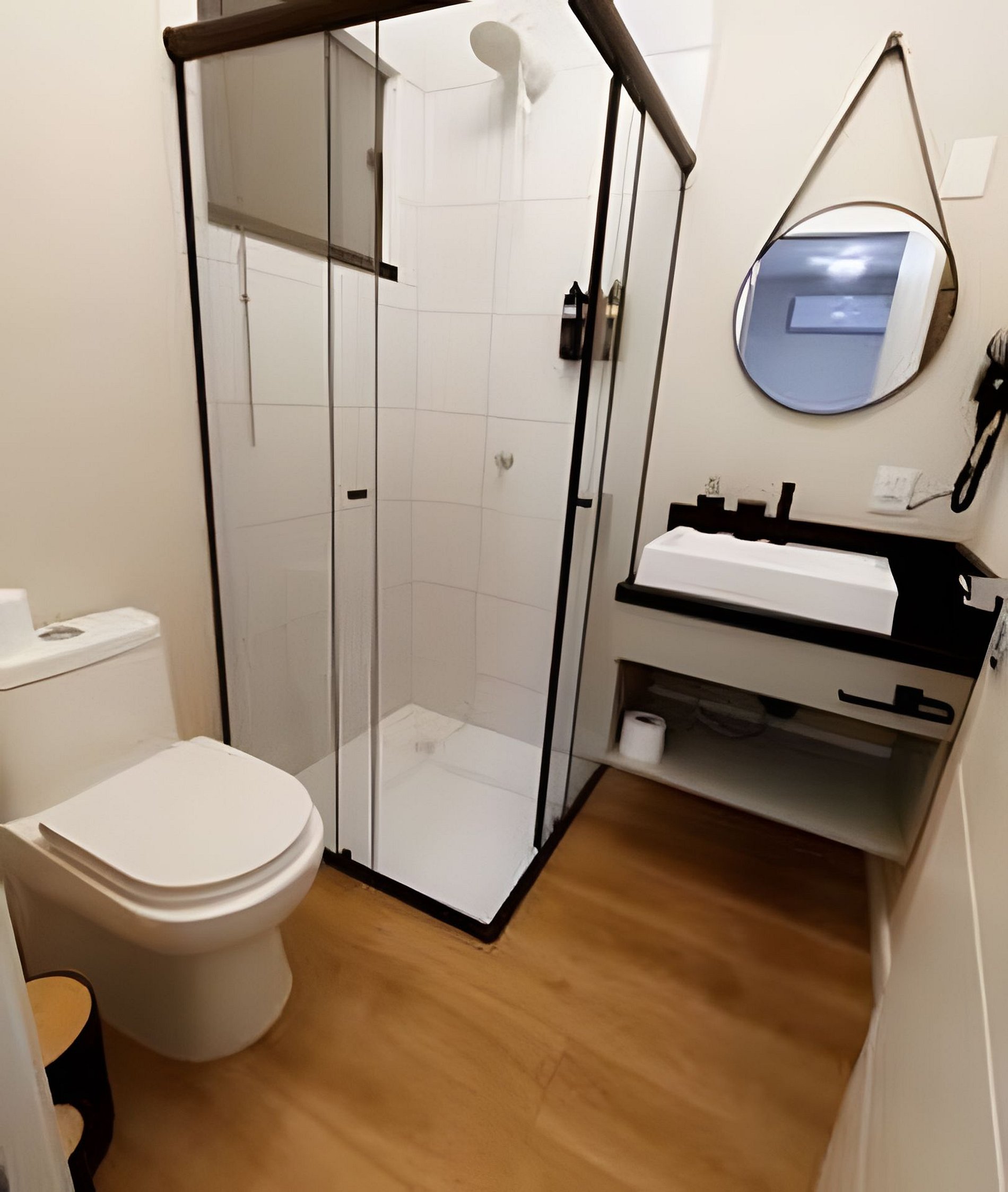 O banheiro apresenta um design moderno, com box de vidro, acabamentos de qualidade e um ambiente limpo e funcional. - Localização e entorno: