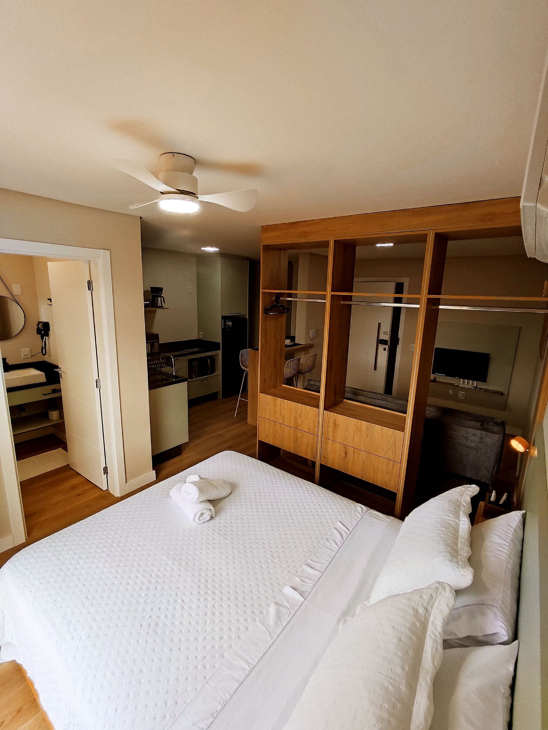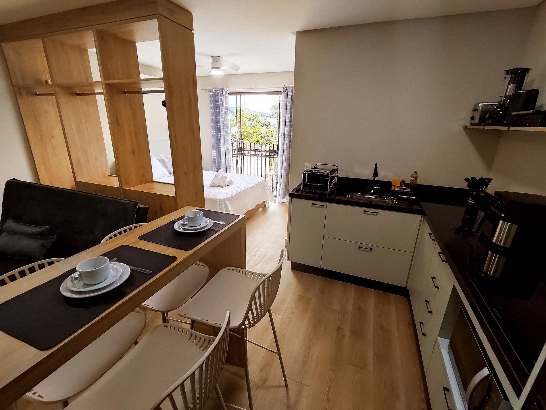 O espaço integra sala, cozinha e quarto de forma harmoniosa, criando uma atmosfera leve e agradável.
