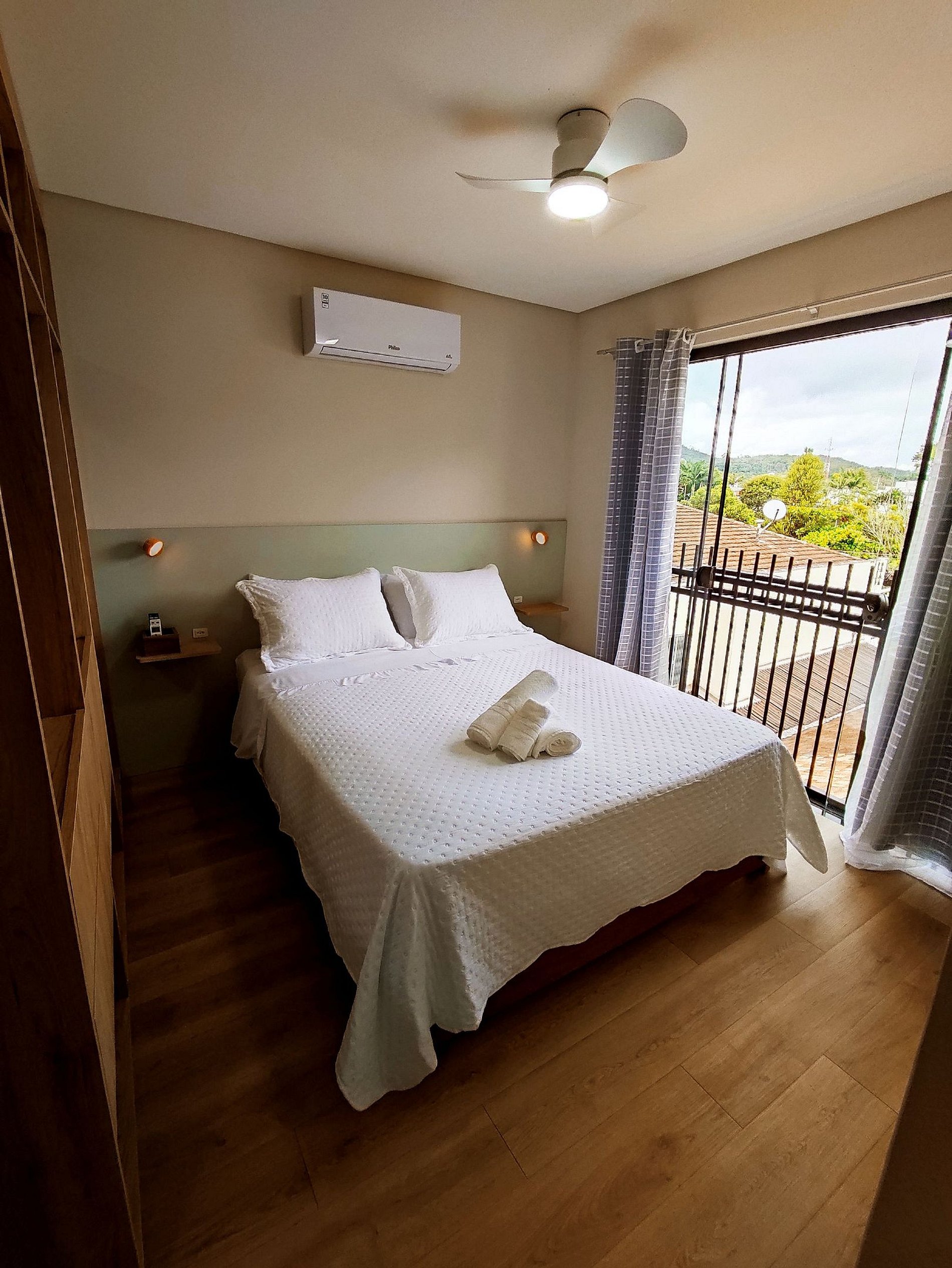 A área de descanso conta com uma cama de casal confortável, posicionada em um ambiente bem iluminado e arejado, com acesso à sacada, que traz ventilação natural e sensação de amplitude.