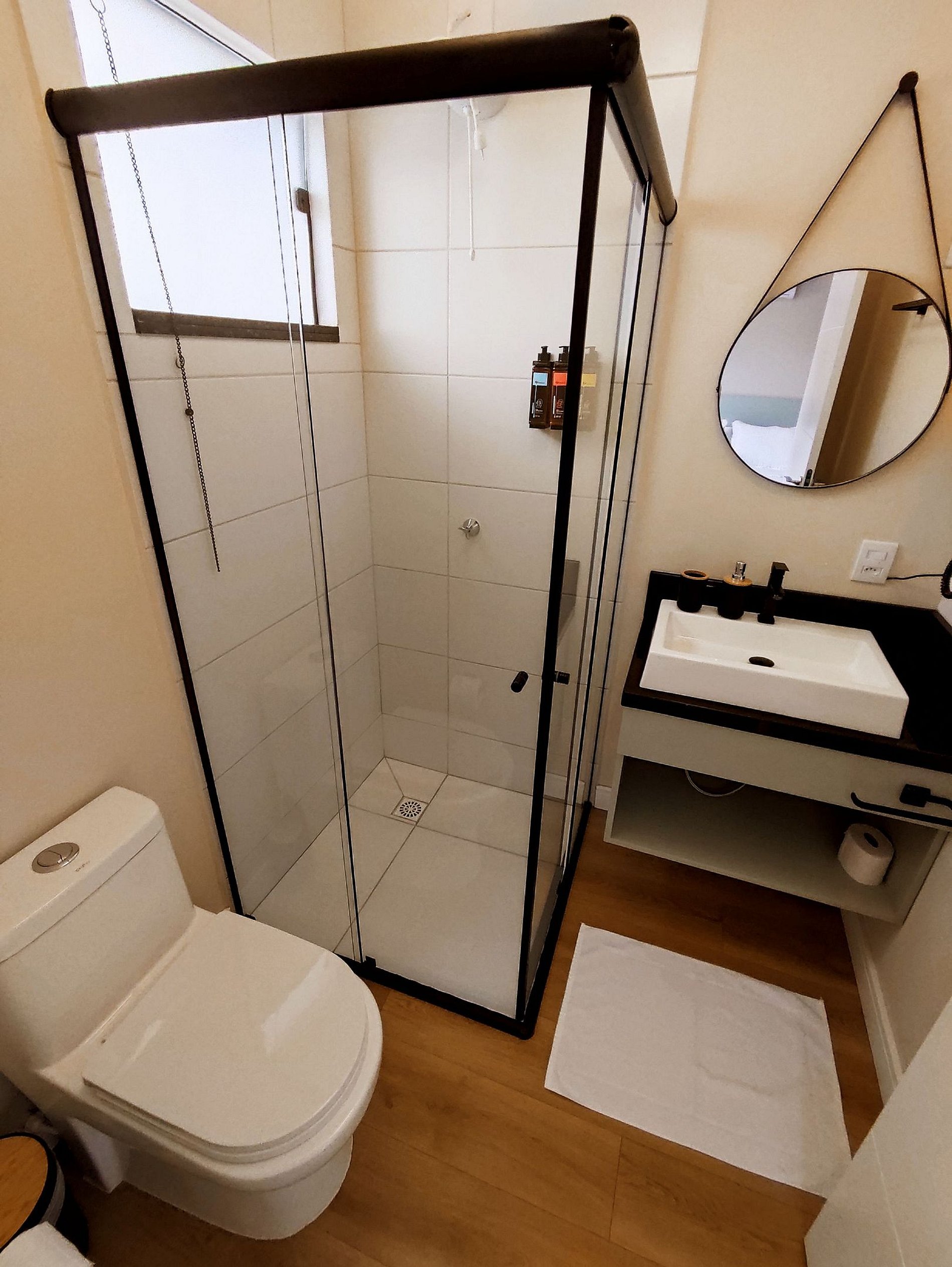 O banheiro apresenta um design moderno, com box de vidro, acabamentos de qualidade e um ambiente limpo e funcional.