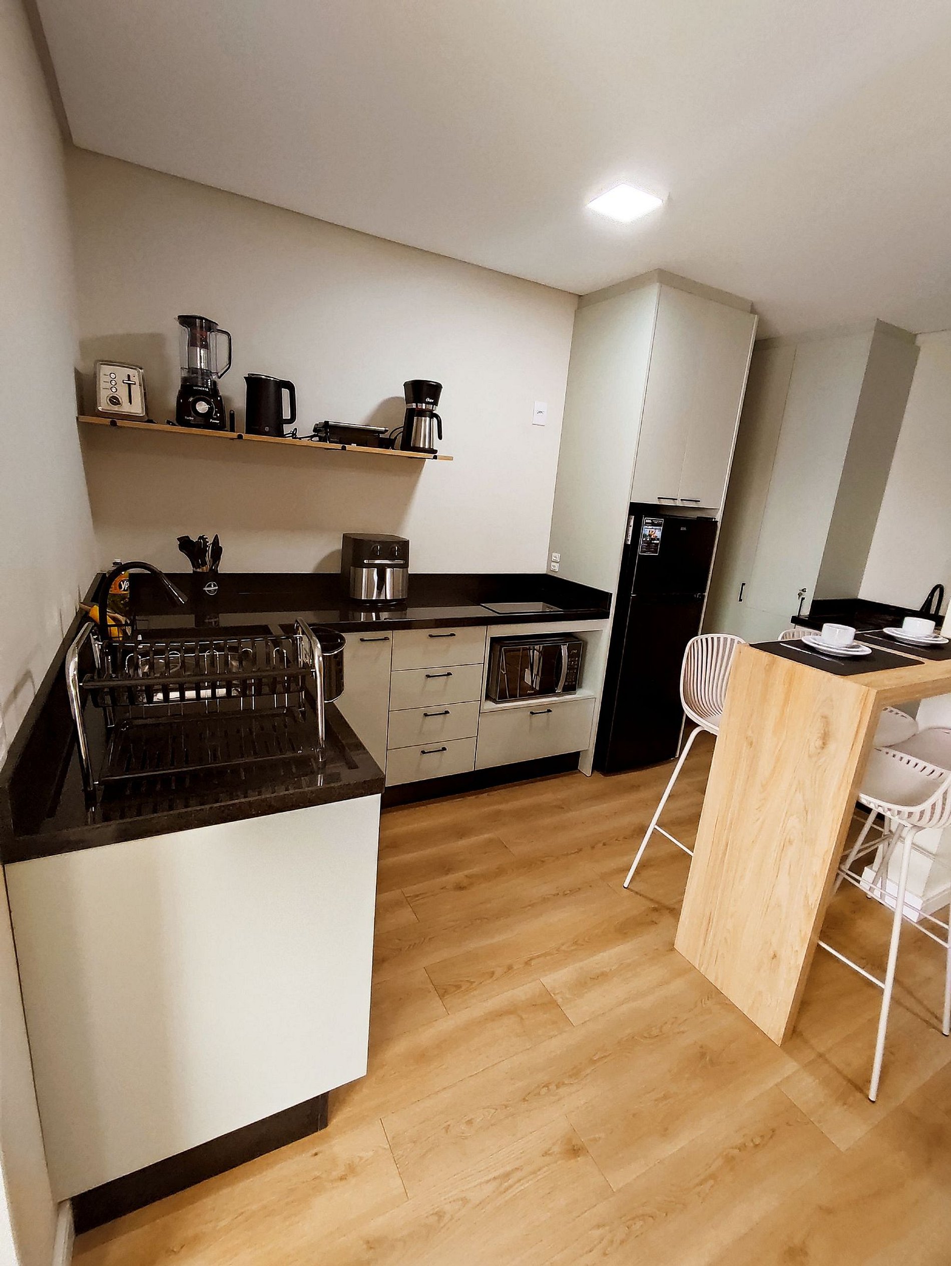 A cozinha é completa e equipada com eletrodomésticos e utensílios que permitem desde um café da manhã prático até refeições completas, atendendo perfeitamente quem busca autonomia durante a estadia.