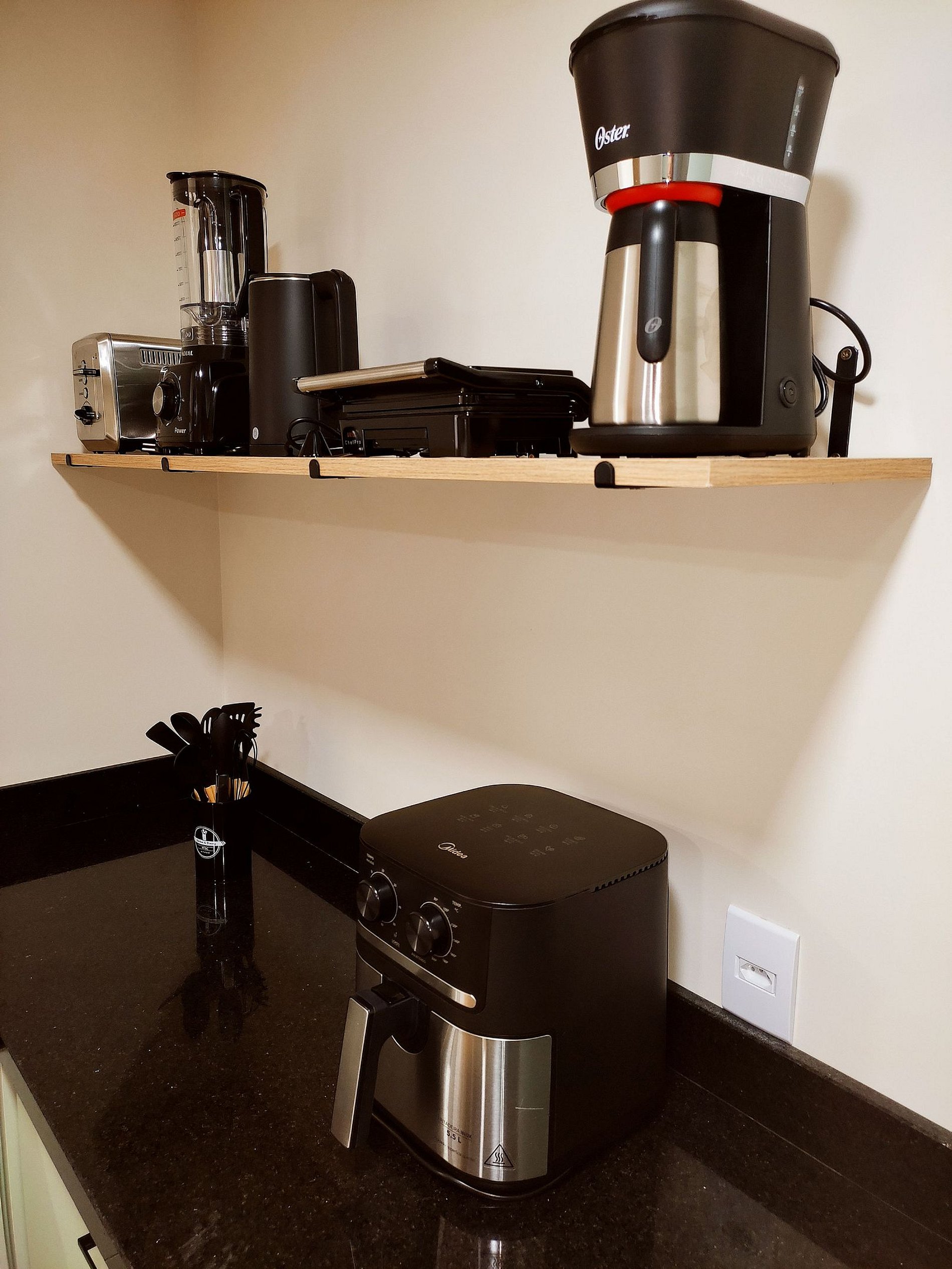 - Comodidades: *Wi-Fi de alta velocidade, *Ar-condicionado, *Cozinha completa e equipada, *Geladeira, *Micro-ondas, *Cafeteira, *Torradeira, *Liquidificador, *Air fryer, *Chaleira elétrica, *Utensílios de cozinha, *Mesa de jantar, *Sofá-cama, *TV, *Banheiro completo com box de vidro, *Secador de cabelo, *Roupas de cama e banho, *Vaga de garagem privativa e coberta, *Elevador, *Ventilador de teto,